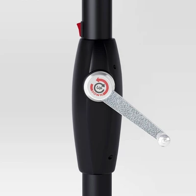 With this 9-Foot x 9-Foot Market Solar Patio Umbrella from Threshold™, your porch or patio will feel like a shady oasis. Made from fade-resistant fabric in a solid hue, this outdoor umbrella has a steel frame and a sleek black-finish pole. Compatible with centered pole umbrella bases (sold separately), it’s easy to set up without the use of any tools, and the crank lift and push-button tilt let you adjust the angle and coverage to keep everyone comfortably shaded.