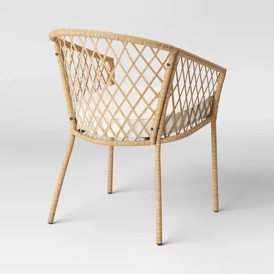 Add coastal charm to your outdoor space with these Exmore 2-Pack Barrel Patio Dining Chairs from Threshold™. This set of two barrel dining chairs features off-white cushioned seats and a cane-like design with a crisscross pattern on classic barrel silhouettes to provide an inviting seating solution for family and friends. Designed with weather-resistant qualities for lasting outdoor use, these dining chairs will be an integral part of your al fresco dining experience.