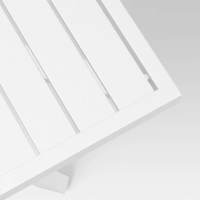 Lay down your book, snack tray and your favorite drink while relaxing outdoors at this Seabury Steel 4-Person Square Patio Dining Table from Threshold™. This steel outdoor dining table makes a practical addition to your backyard, patio, deck or any other outdoor entertaining space. It features an umbrella hole with cap and a modern square shape with a slatted top for resting your drinks, dishes and other items. The weather-resistant and powder-coated finish allows for use season after season, and the off-white frame coordinates with any decor. Pair with other furniture pieces from the same collection for a cohesive look.
